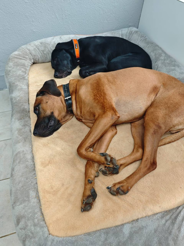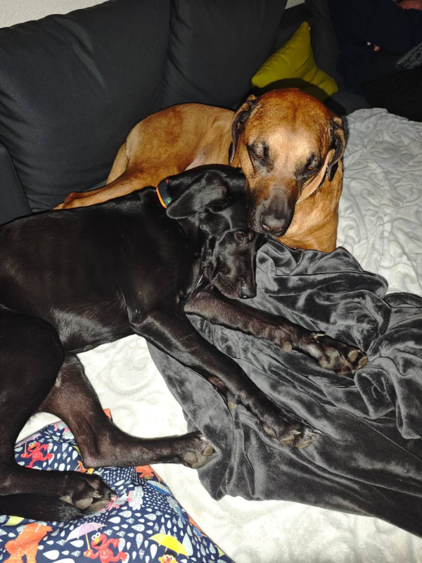 - das ist die Antwort von Ares Frauchen darauf, wie sich der junge Mann eingelebt hat. Wir würden sagen, dass wir hier ein wunderbares zu Hause für den Ridgeback Labrador Mix gefunden haben.